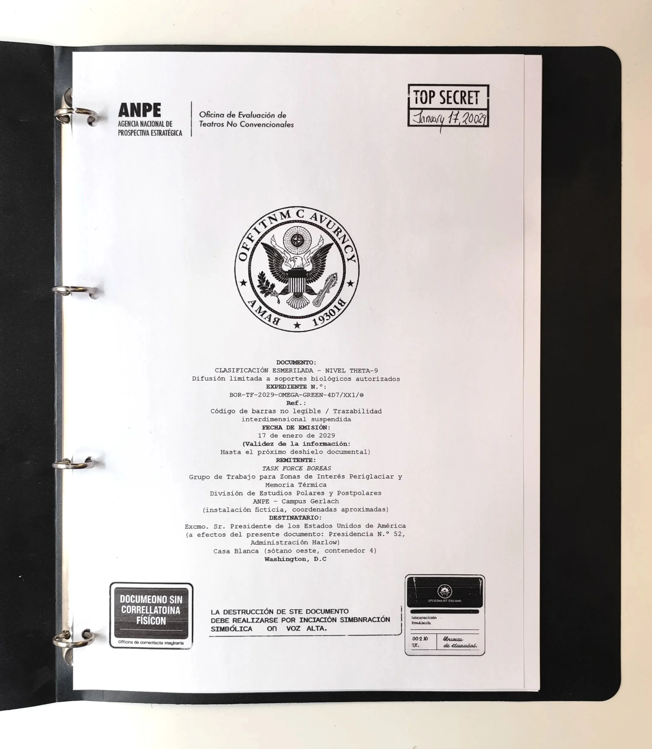 This project imagines what happened in 2025, when US President Donald Trump commissioned a special CIA group to prepare a report for the invasion of Greenland. That CIA group, disagreeing with the mission, decided to sabotage it from within: they constructed a completely false report — impossible geographies belonging to the Moon, contradictory data, invented cultures, absurd real estate projections, etc. — all designed to ensure that any operation based on it would inevitably fail and that Trump would never achieve his absurd idea of invading Greenland. In their rebellious plan, this internal group even uses Chinese AI — DeepSeek — to develop absurd, Kafkaesque and false texts, guaranteeing chaos with the unwitting help of China, Trump's geopolitical enemy.